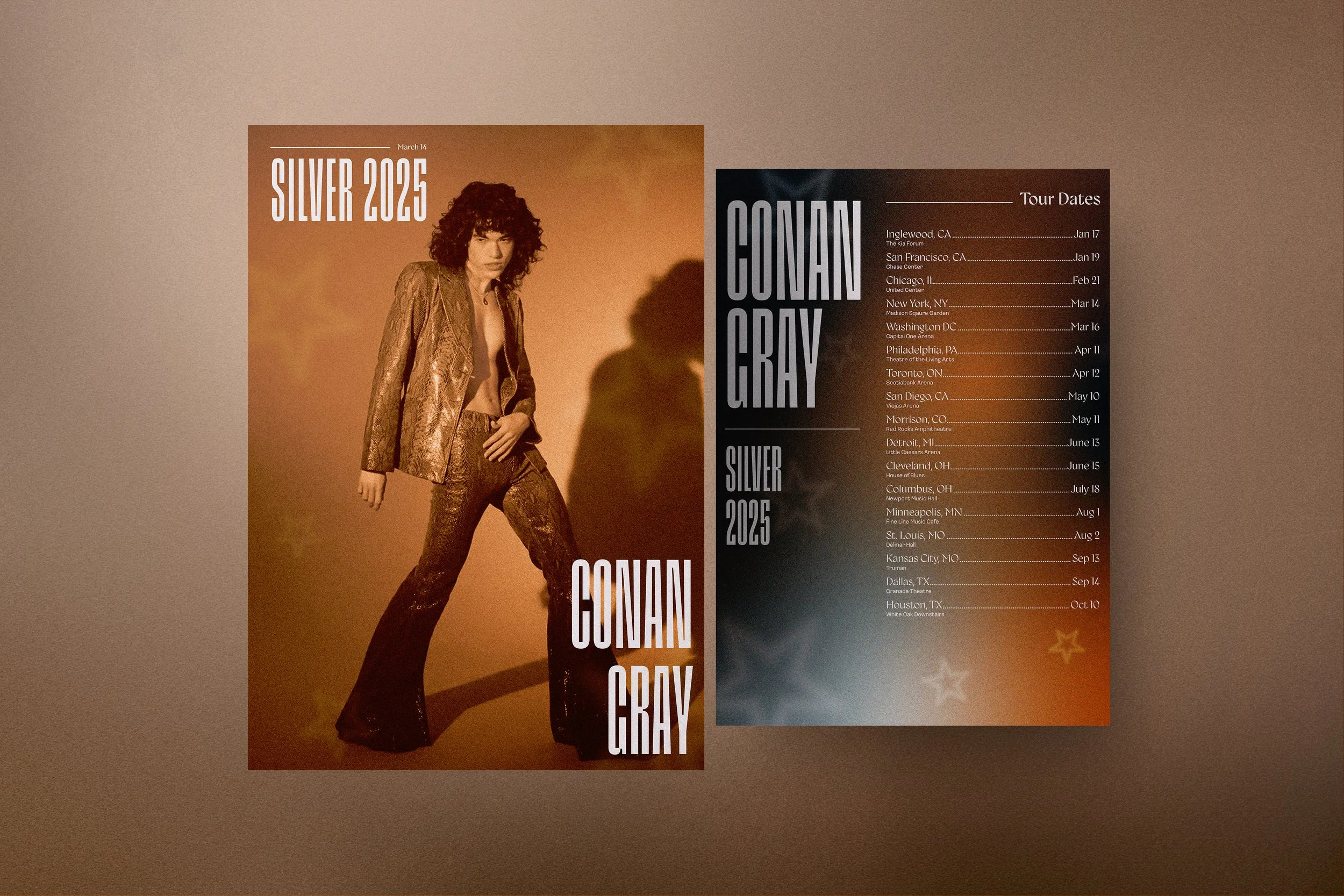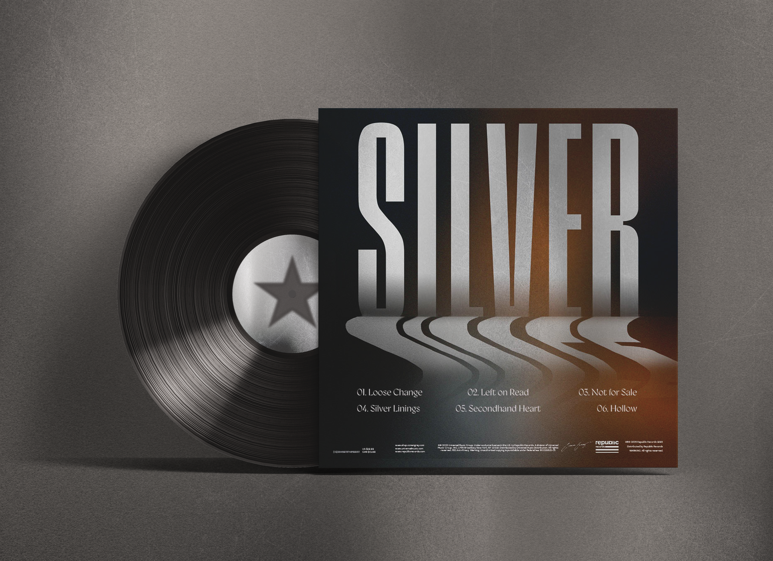 Silver is a conceptual vinyl album for Conan Gray that explores themes of heartbreak and unrequited love. The album title reflects the idea that, like silver, love can tarnish over time, and that it is often considered second to gold. I developed the album concept, named the tracks, and designed the full visual identity, including the album cover, vinyl packaging, and interior inclusions such as a poster and an exclusive necklace.