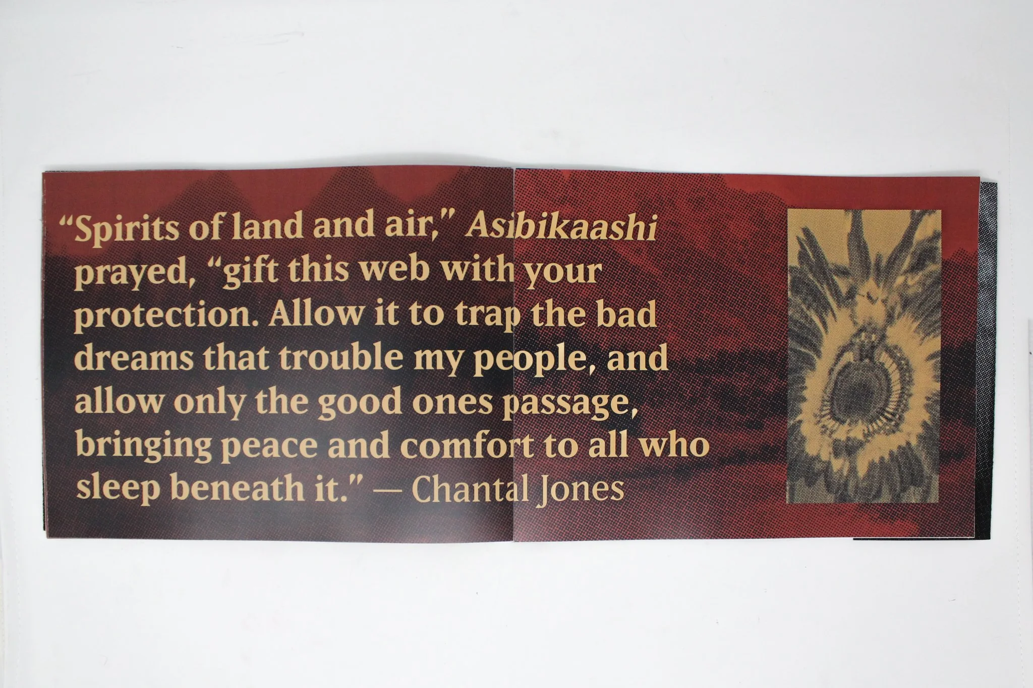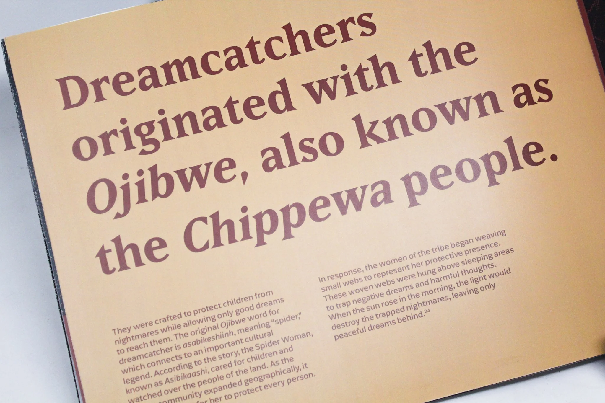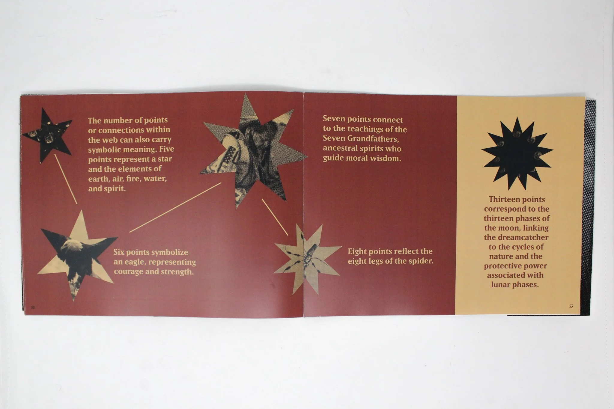 The beige and sienna tones reference the Great Lakes and Great Plains regions in which the Ojibwe communities lived. There was a significant amount of information to represent in this section, so I chose to diagram the points within the dreamcatcher on page 52. The images placed within the different star shapes help make the symbolic meanings of the dreamcatcher easier to navigate and understand. A vellum overlay of a spider within the web was included to reference the importance of spiders in the origin of the dreamcatcher.