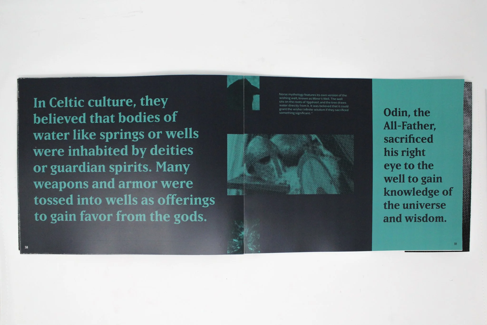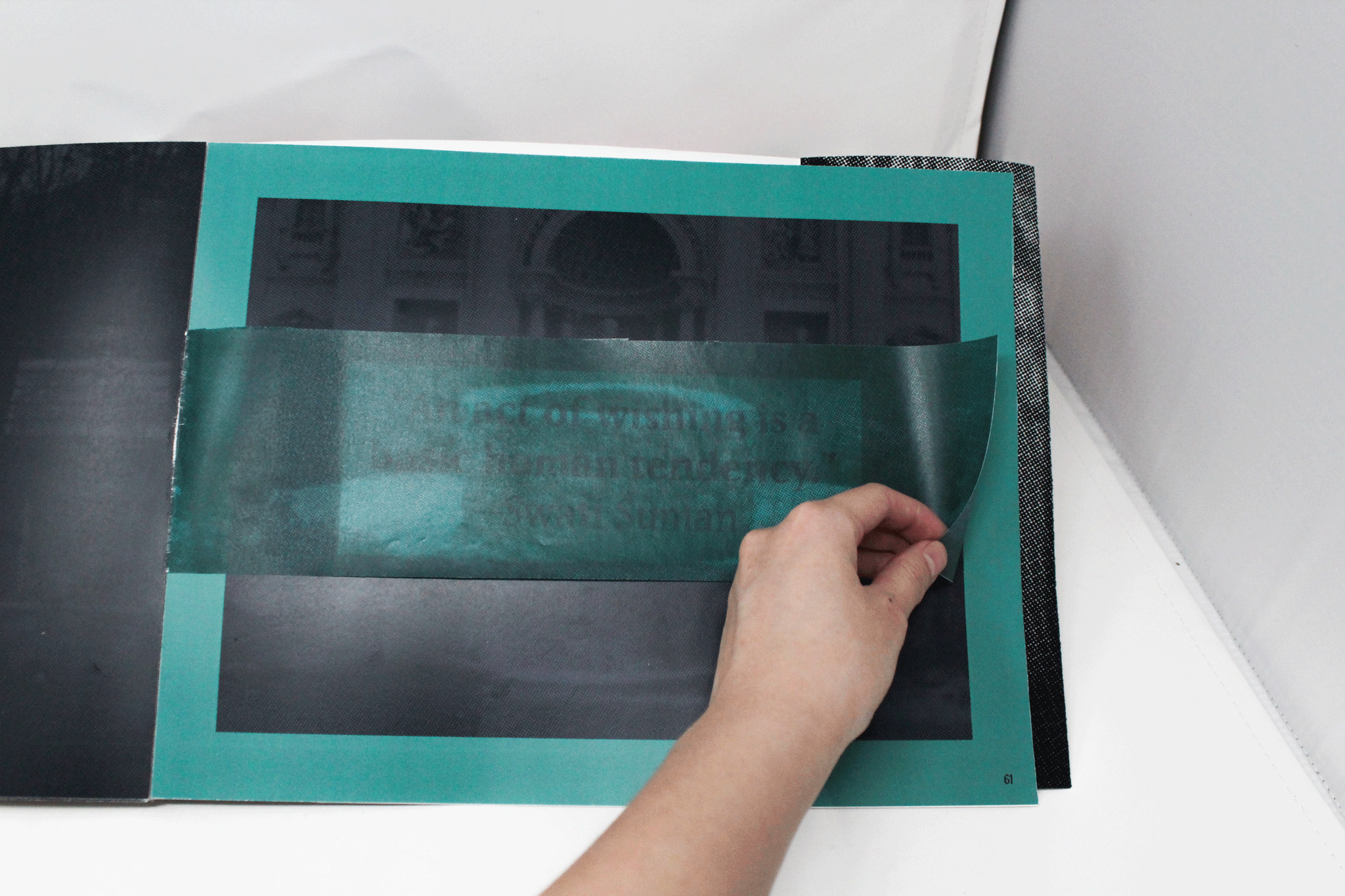 Black and green are not colors typically associated with wishing wells, but they are connected to Norse mythology. Green represents fertility, renewal, and the cycles of life. In Norse belief, the World Tree, Yggdrasil, symbolizes the continuous cycle of nature, life, and death. Black represents the depth of the well, while the green is muted to complement this darker base and create contrast within the spread. On page 61, instead of covering the entire page, vellum is used selectively over the quotes. This creates a contrast between the traditional concept of wishing wells and the more modern interpretation of the Trevi Fountain.