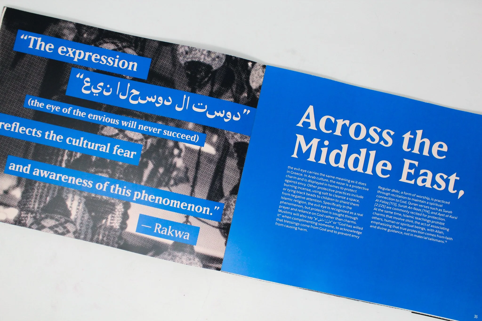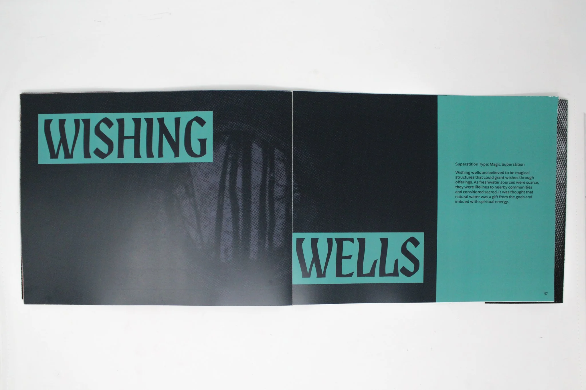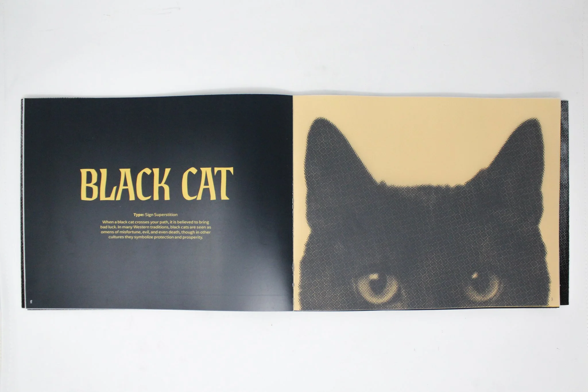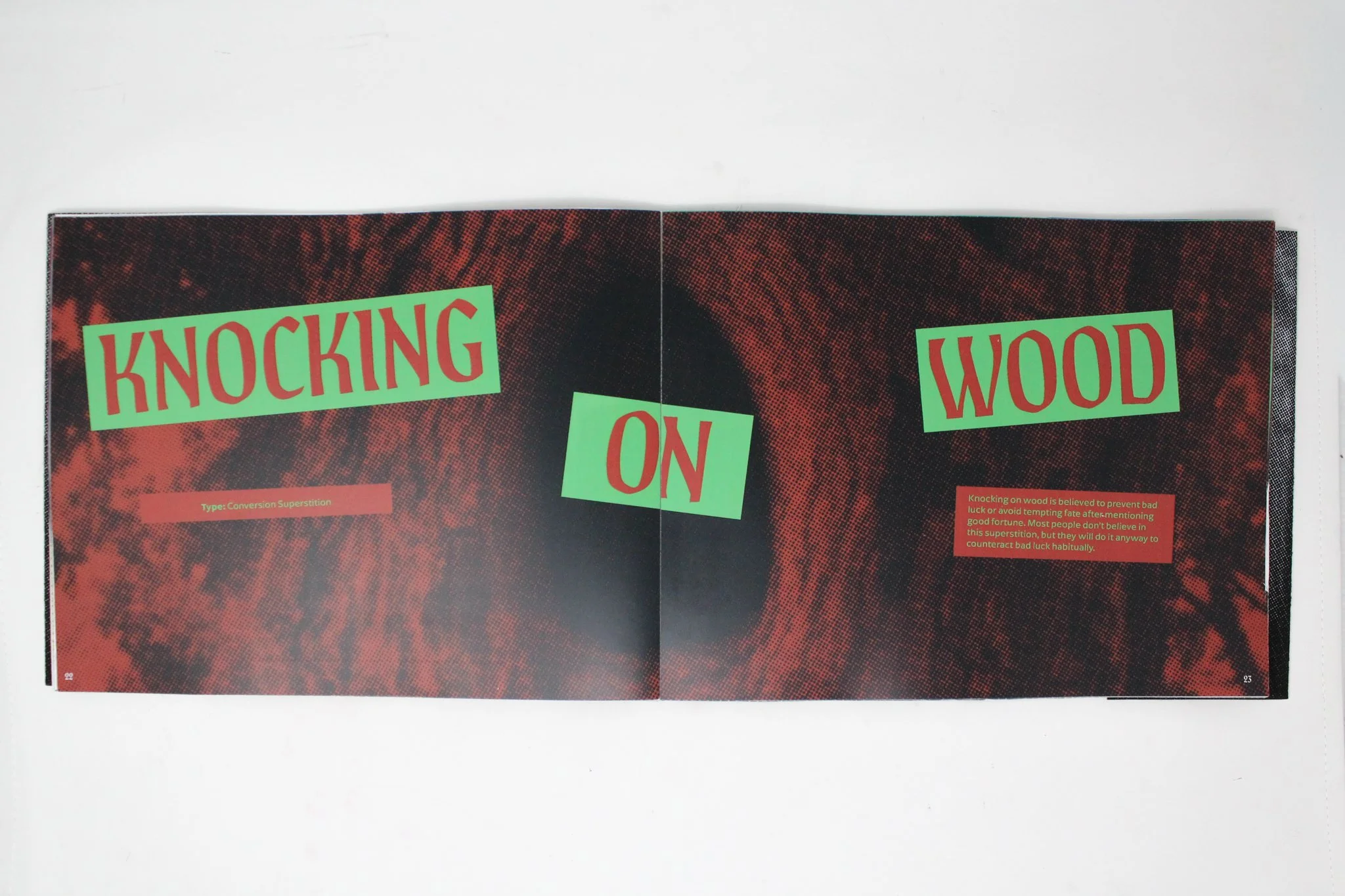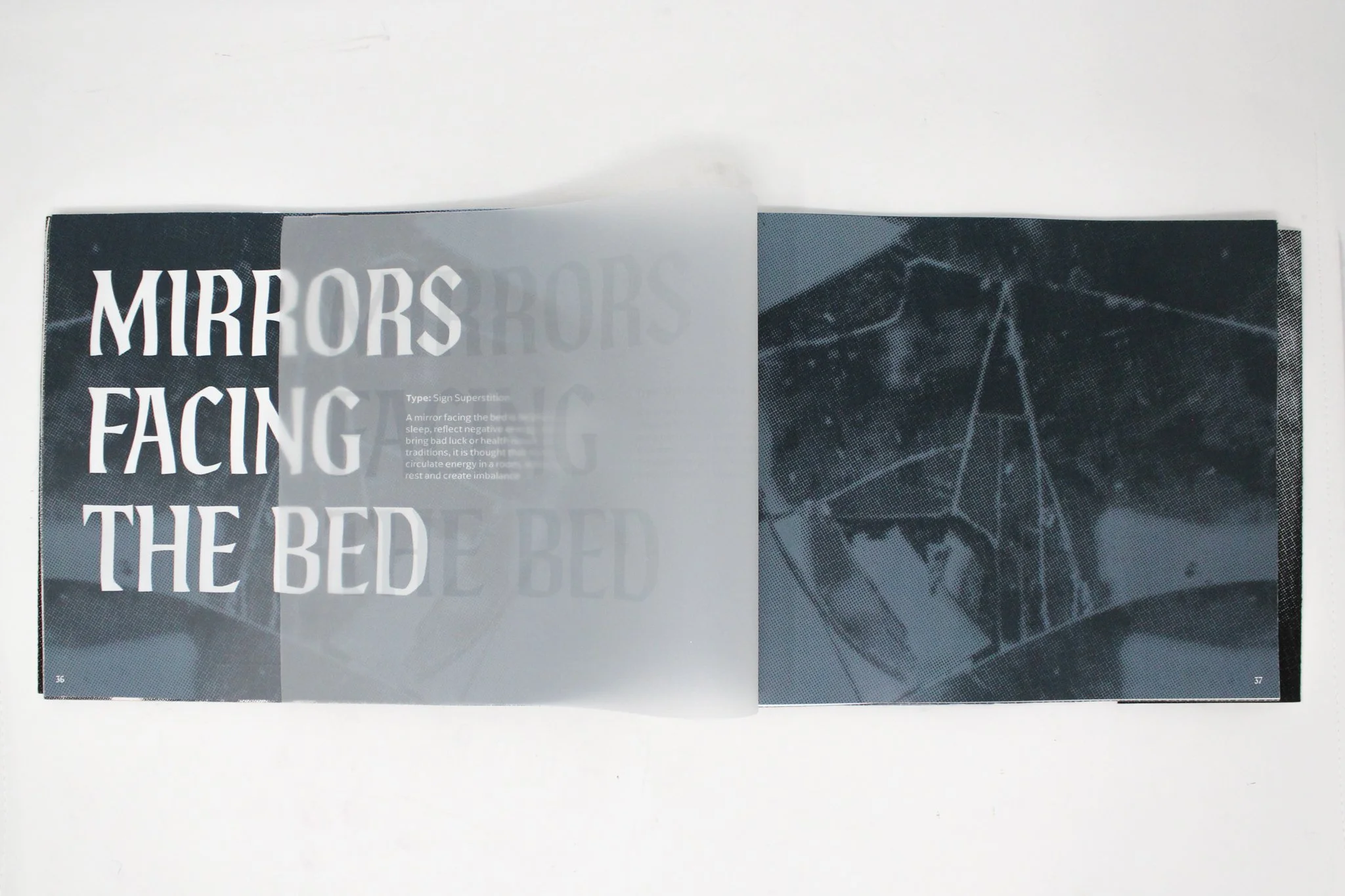 Within my design, I wanted to incorporate a zine‑like style, so I began bitmapping images to add texture and create a more tactile feel. I limited each spread to two colors to maintain consistency while still allowing variation between sections. Every layout and color choice was carefully considered, with color serving as a symbol that references the history behind each superstition. The placement of the vellum pages was also intentional, designed to make the book more interactive and engaging as the reader flips through it.