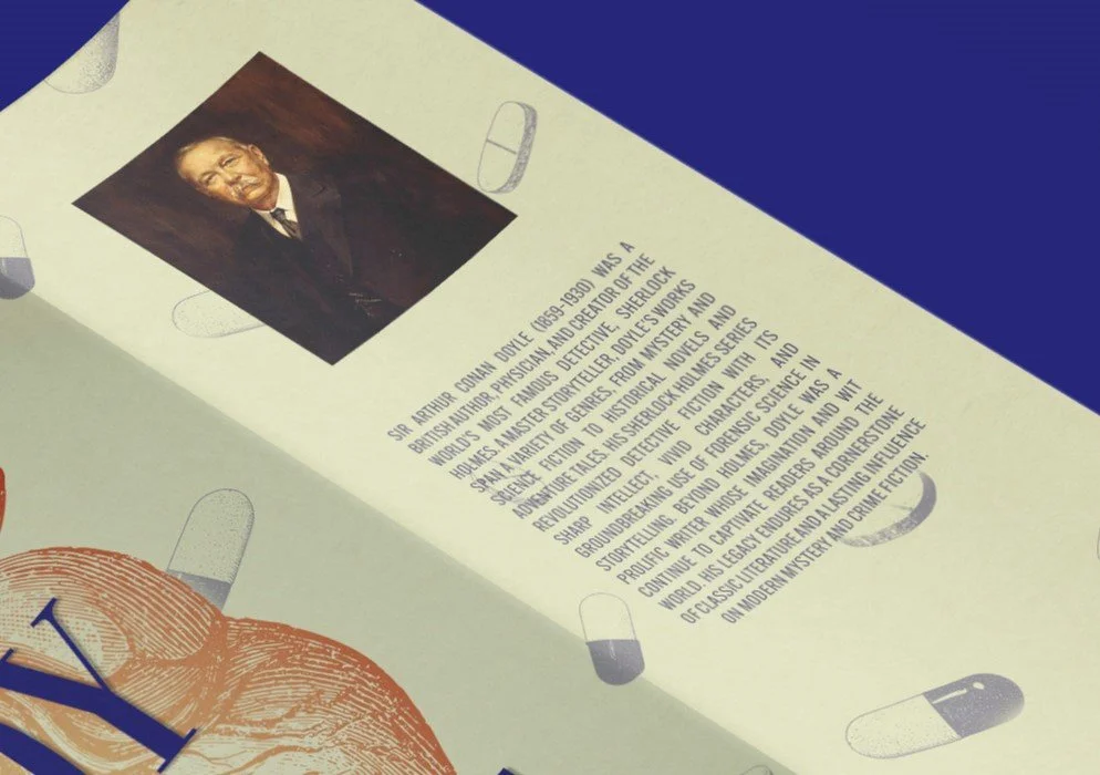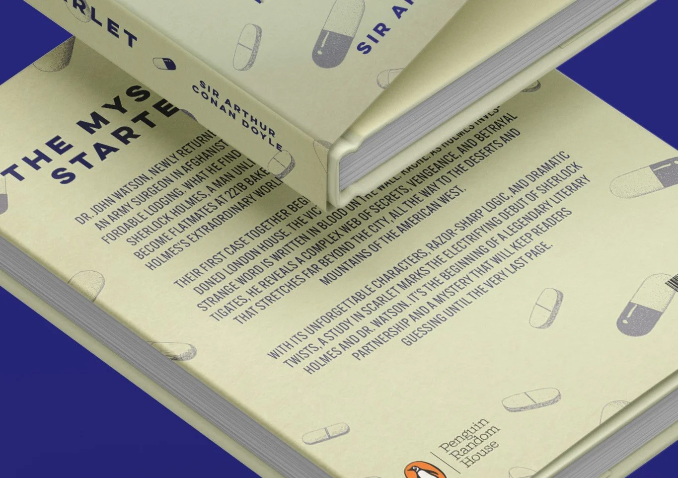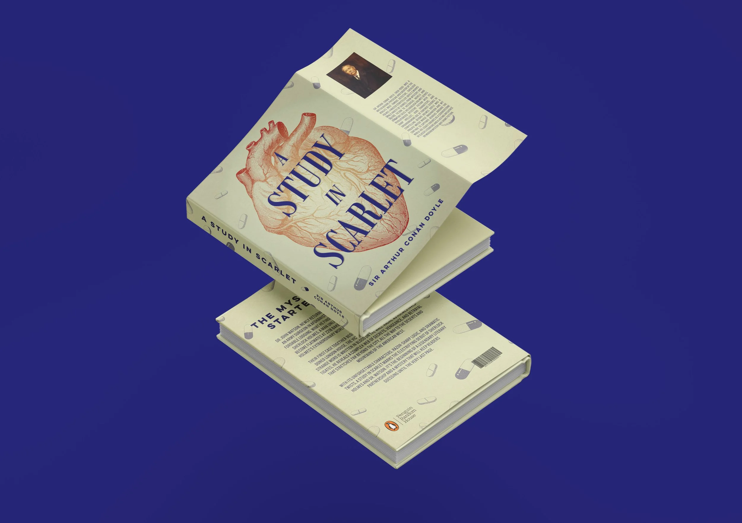 This project is a complete book cover design for A Study in Scarlet by Arthur Conan Doyle. I designed the front cover, spine, back cover, and inner flap, creating a cohesive visual identity that reflects the story’s mystery and suspense.