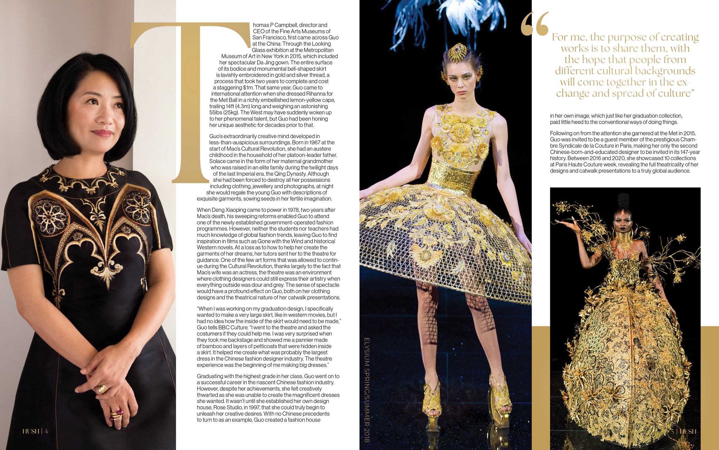 This project is a publication design for the Society of Publication Designers 2025 Student Outreach Program. I designed a magazine cover and two editorial spreads focused on fashion designer Guo Pei, highlighting her innovative designs and creative vision. The project involved developing a cohesive visual style, layout, and typography.